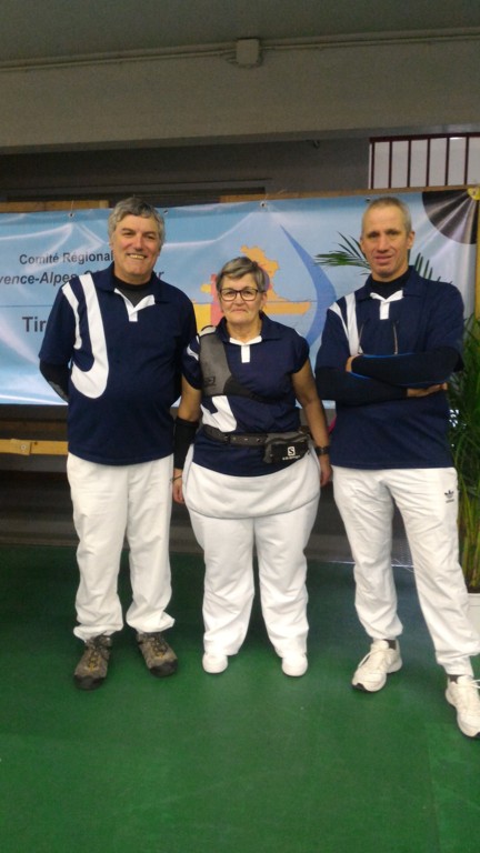 "A Marignane, le week-end des 11 & 12 février 2017 , s'est tenu au gymnase Le Carestier", le Championnat Régional de tir à l'arc de la Ligue PACA. Le samedi, place aux jeunes et le dimanche c'est au tour des séniors. A 18m sur blason tri-spot se sont 220 archères et archers qui s'affrontent pour remporter le titre de Champion de ligue dans sa catégorie. Cette rencontre est également qualificative pour le championnat de France à Vittel au printemps prochain. Quelques explications s'imposent. Ce concours se décompose en deux parties : d'une part les phases qualificatives classiquement en 2 fois de 10 volées de 3 flèches, et d'autre part, les duels. Ces duels se pratiquent en 5 sets gagnants; l'archer qui gagne son set marque 2 points, et le perdant zéro; s'il y a égalité chaque archer marquera 1 point. A l'issue des 5 sets si les 2 archers sont à égalité de points, ils tireront une flèche dans le blason du milieu: c'est la flèche de barrage. L'archer qui sera au plus près du centre sera déclaré vainqueur. Il arrive que pour départager les 2 tirs, il soit nécessaire d'utiliser un compas à pointes sèches afin de déterminer qui est au plus près de la croix centrale; quel stress !! C'est ainsi que 3 archers de la Compagnie des Archers des Ecrins de l'Argentière-la-Bessée se sont livrés à cet exercice. Christianne MASSON, après 4 duels éprouvants perd la petite finale à 1 point près ! elle est 4ème dans sa catégorie de super vétérante. Alain SANCHEZ quitte le pas de tir en quart de finale après avoir été départagé par cette redoutable flèche de barrage. Quant à Hubert Brielle, il s'incline en quart de finale avec le score de 2 points contre 6 pour son adversaire. Félicitations à ces trois compétiteurs qui nous ont fait vivre des moments intenses et particulièrement très appréciés."